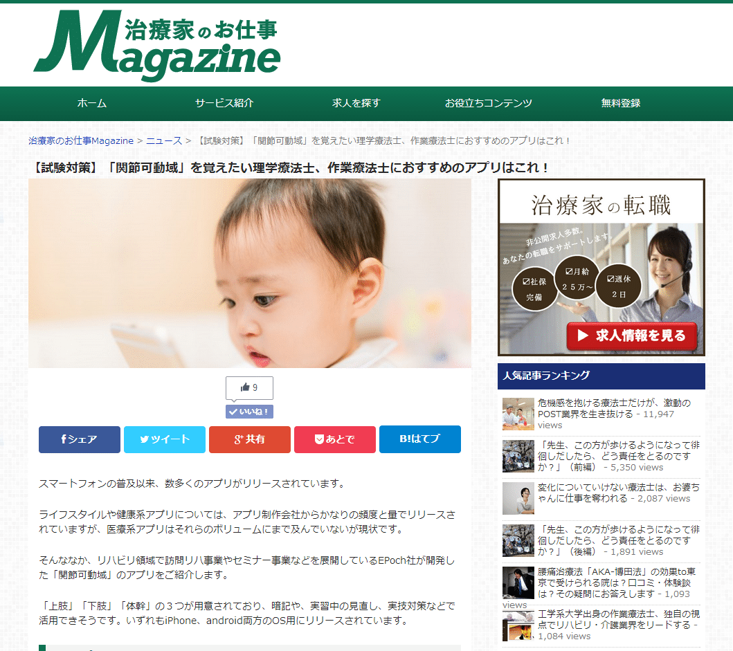 メディア掲載 『治療家のお仕事 Magazine』掲載されました[医療用アプリ] 2015.01.30 [st-widecolumn myclass=”” bgcolor=”” add_style=”” shadow=”on”] 弊社のスマートフォンアプリ『関節可動域』が インタビューが『治療家のお仕事 Magazine』に掲載されました。 柔道整復師やあん摩マッサージ指圧師のためのサイトでも注目されるほど、 弊社のスマートフォンアプリは沢山の方にお使い頂いております。 [/st-widecolumn]